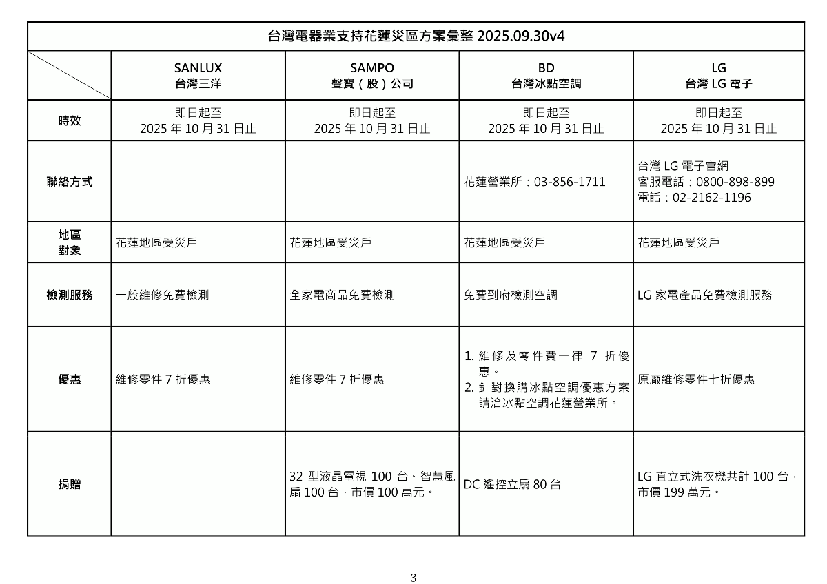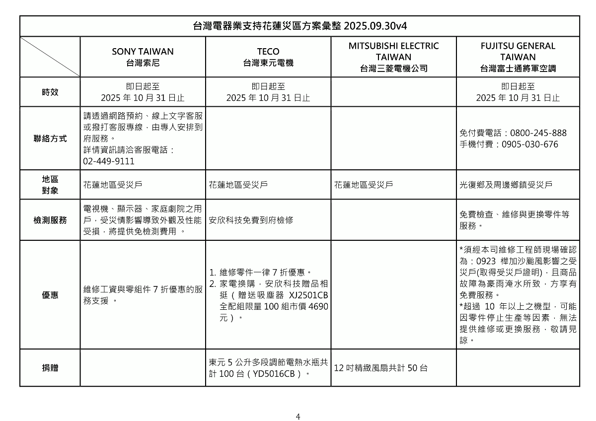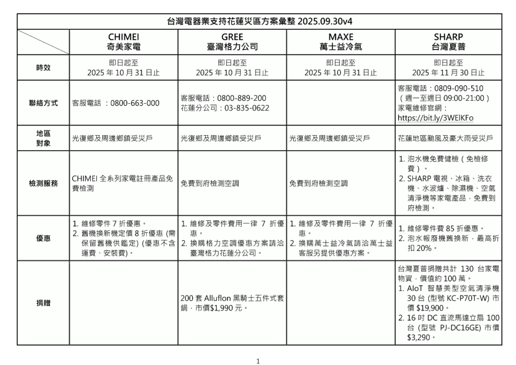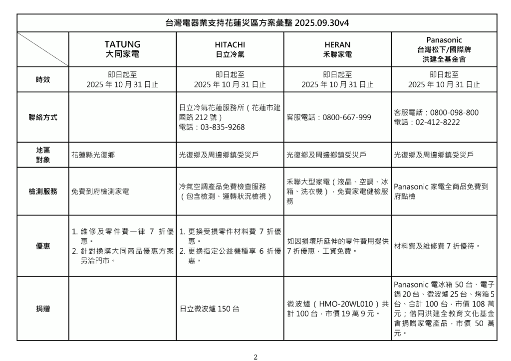 台灣電器業支持花蓮災區方案彙整