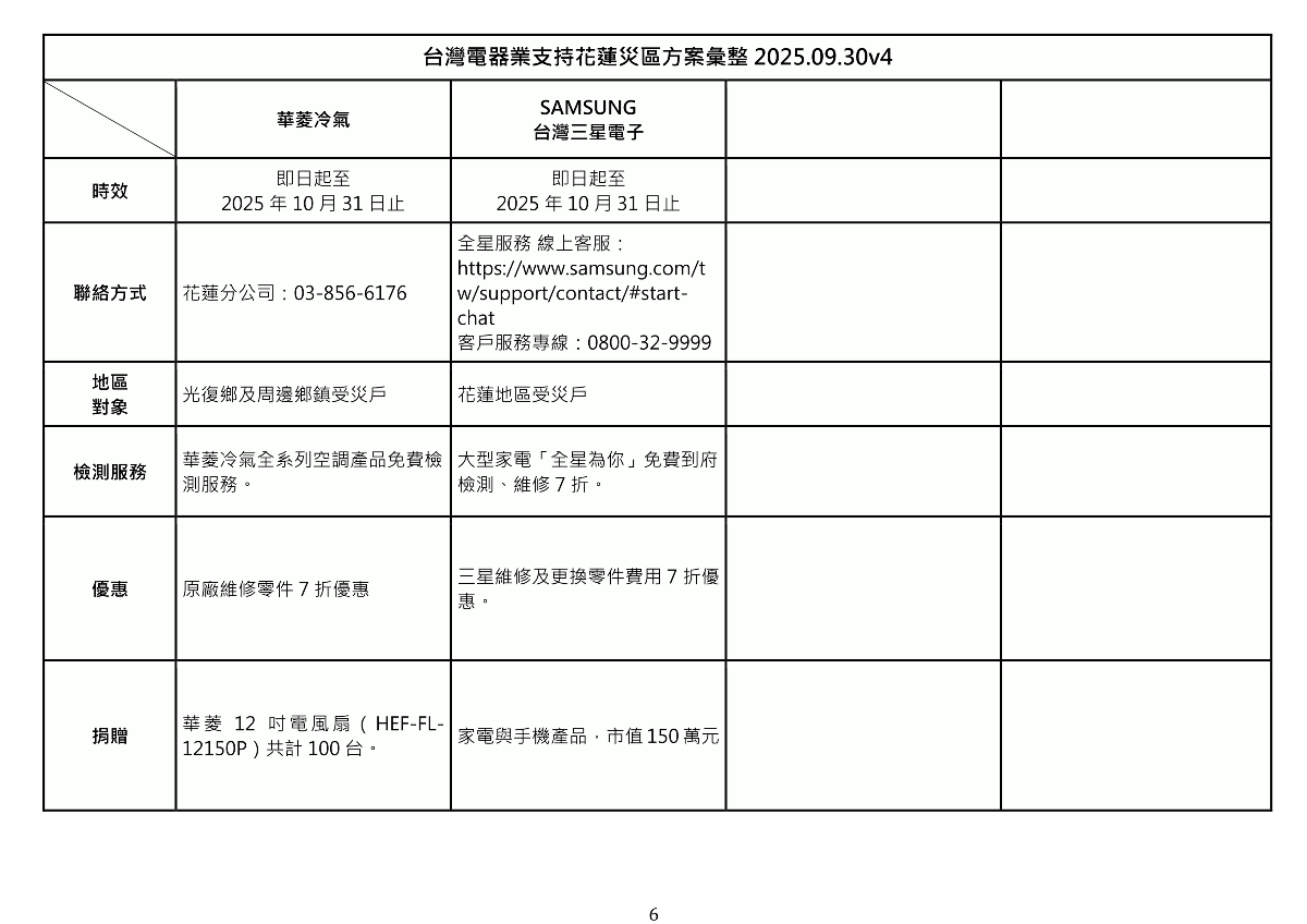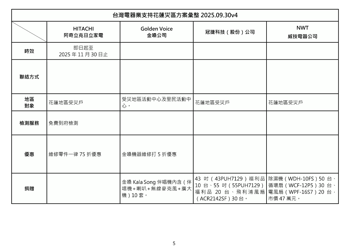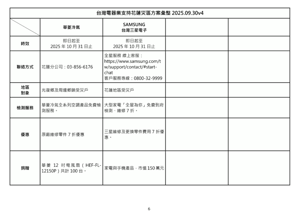 台灣電器業支持花蓮災區方案彙整